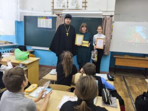 Батюшка вручил участникам конкурса сертификаты и сладости, победителям дипломы и памятные подарки, а также поздравил подготовивших победителей педагогов М.А. Королеву и О.А. Голубеву.